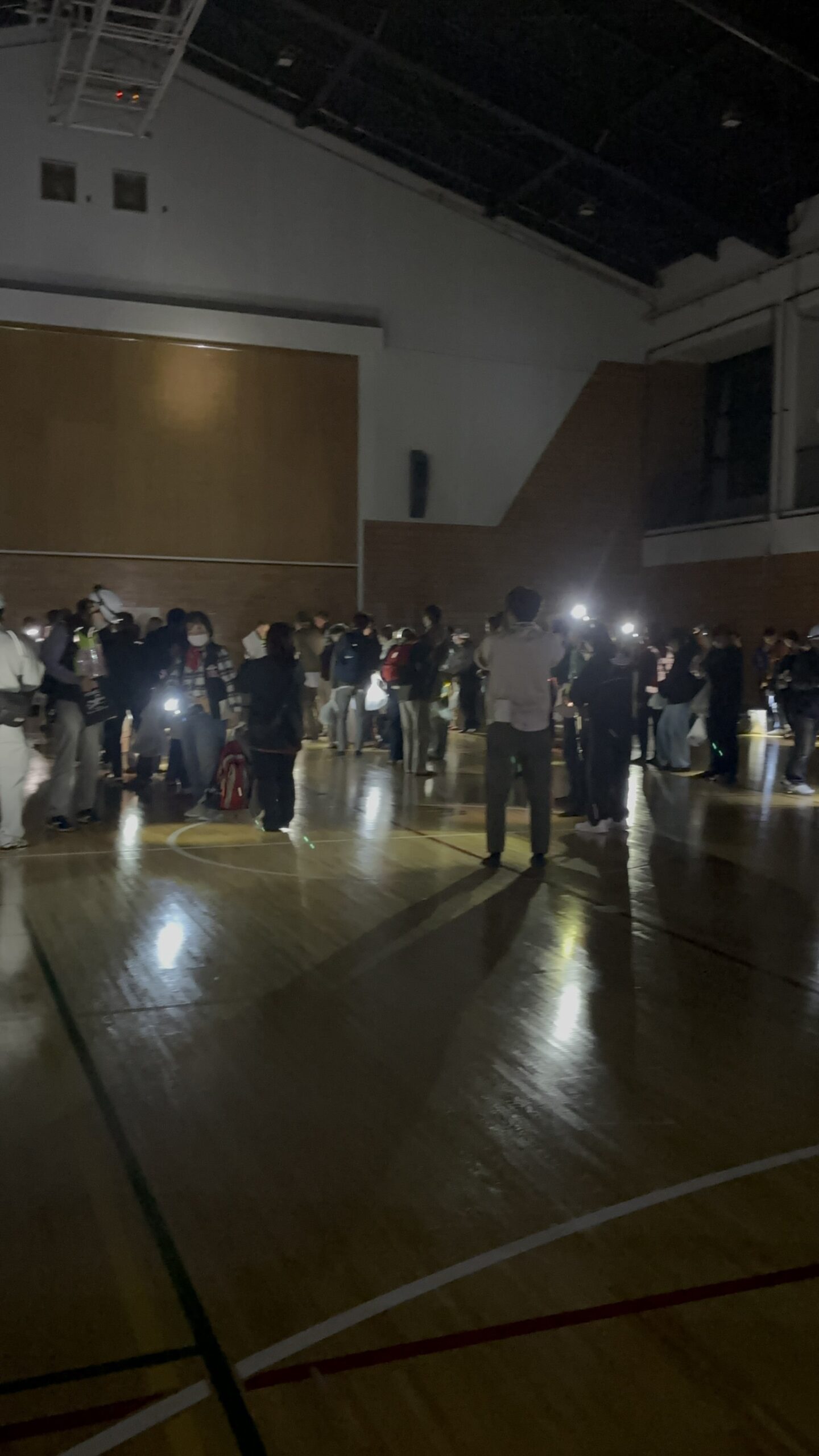 暗闇の体育館の中で、懐中電灯やスマホの灯りを頼りに動くみなさんの姿に“地域の力”と“備える意識”の大切さを改めて感じました。
