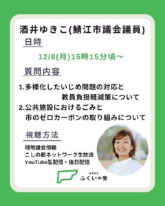 📅 日時:12月8日(月) 15:15頃〜45分間 📍 鯖江市役所 3階 議場 💻 こしの都ネットワーク生放送・鯖江市議会YouTube配信あり🔍 今回は 市民の安心・子どもの未来・環境のこと を中心に一般質問を行います […]