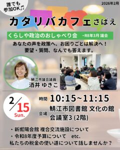 \皆さんとの意見交換会♪/ カタリバカフェ さばえ 2月も開催します〜✨😊 ☕️くらしや政治のおしゃべり会☕️ 今回は3月議会に出された令和8年度予算の説明や嚮陽会館複合交流施設の概要について...などなど。 そして皆さ […]
