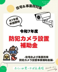 実は…鯖江市では ご自宅やお店に防犯カメラをつける時に補助金が出ます😊今年度の申請が始まりました📣👏 「物騒なニュースが増えて心配…」「夜道が不安…」そんな声に応える制度です😌🌙 🛡️ 安心ポイント ・補助率はなんと【1 […]